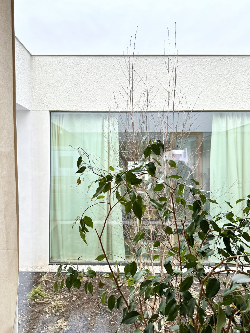 Dům se stromem uprostřed a vším ostatním okolo: Společenskou zónou, která začíná hned za vstupem, kde se vaří a u toho povídá, večeří u velkého centrálního stolu s jakkoliv početnou návštěvou a pak sedí u krbového ohně s výhledem ven. Soukromou částí s ložnicí, šatnou a oddělenou koupelnou, ale také spoustou knih a přímým vstupem k bazénu a do samostatné pracovny. Venkovní krytou terasou s místem pro letní grilování i odpočinek, na který může znovu přímo navazovat plavecké intermezzo.