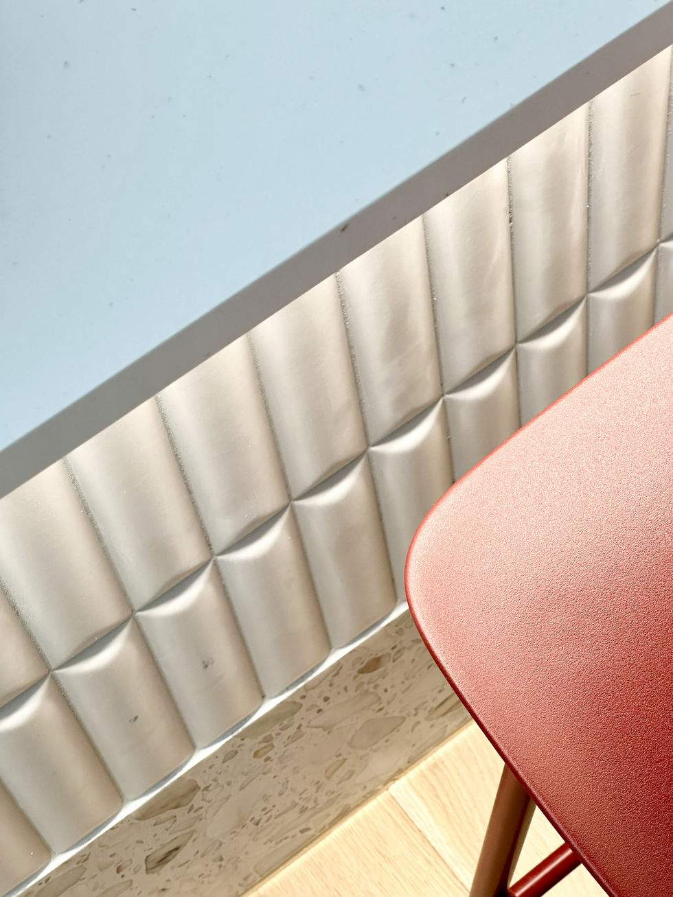 Celá stavba má světlou omítku ze stříkaného betonu, v přízemním podlaží hlazenou a od stropu výše hrubou, která se propisuje i do interiéru. Stropní desku nesou ocelové sloupy, střecha je celá kryta divokou vegetací, okna i dveře mají rámy z masivního dřeva.